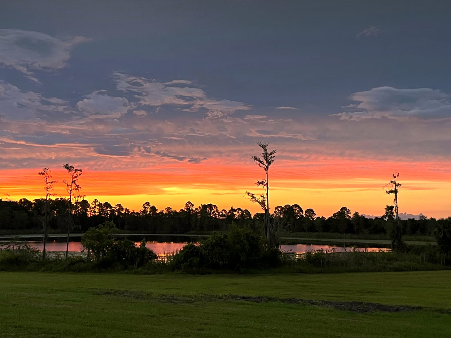 Last Saturday evening as night was gathering in and we were driving home, I saw peeking in and out of the oaks that lined the road a beautiful array of sunset colors – dark blue grays, brilliant orange and yellow. The odd thing was, it wasn’t to the west, it was in the direction of home – north. I suggested a slightly different route to speed us more quickly to this transient display and as we passed under the highway, the vista opened to our north as we approached Yankee Lake and the Lower Wekiva Preserve that borders our home. We pulled to the side, quickly aimed our phones and did our best to capture this amazing light show. In just a few minutes the light expired and we could but hold the moment in a more expansive memory and in the smaller digital capacity of our phones.